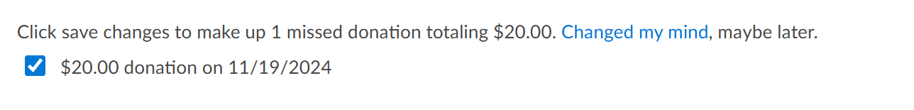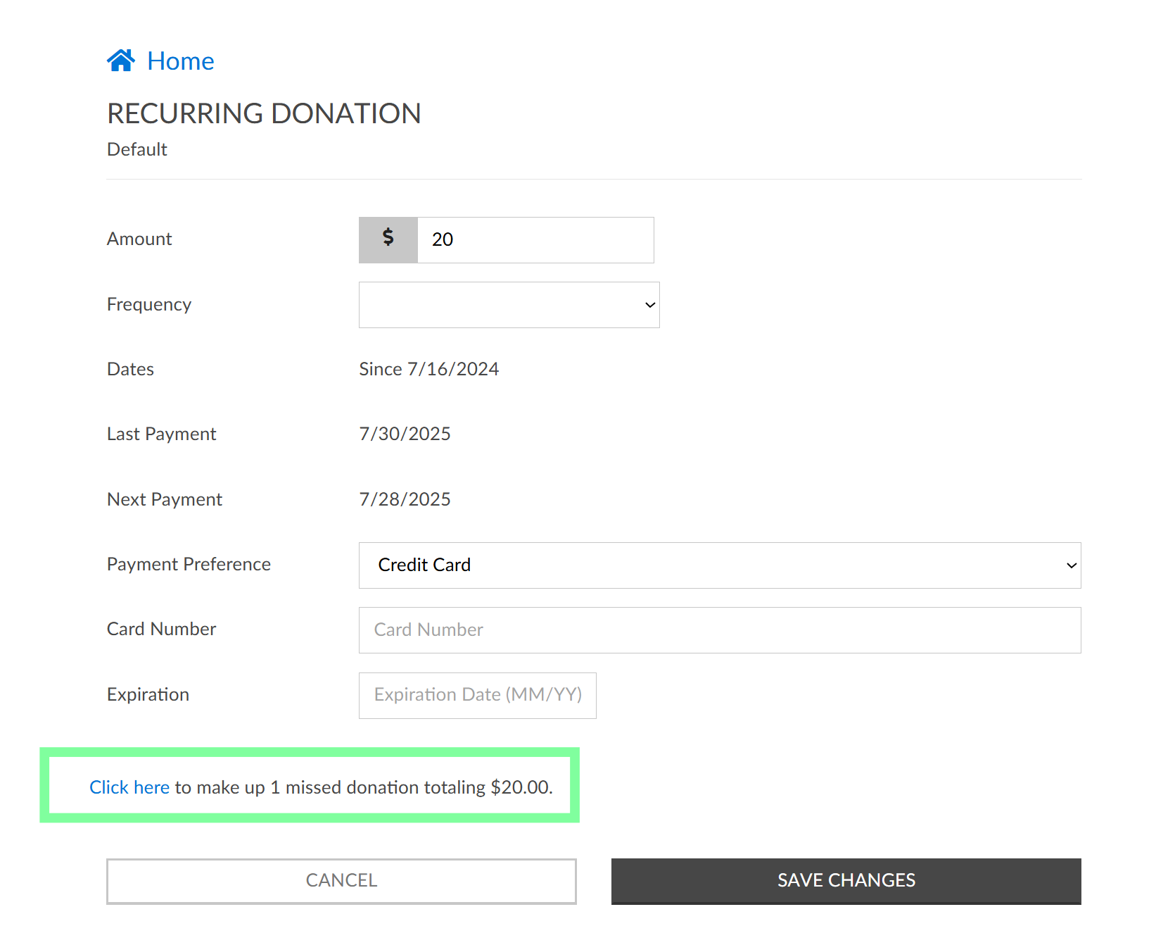 Monthly donors can pay missed donations while updating their account information in the Constituent Portal. This makes it easy for supporters to catch up on the contributions missed due to an expired credit card, helping your organization recover revenue that might otherwise be lost.